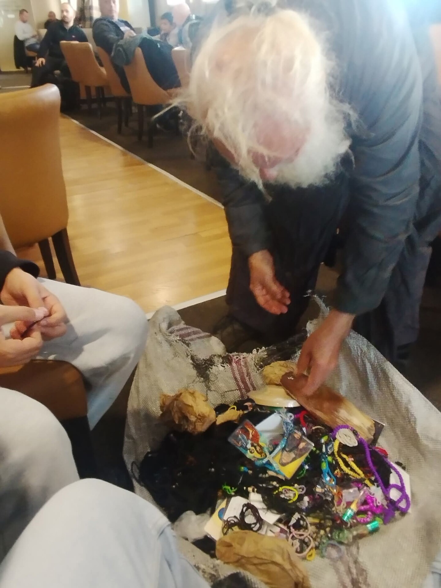 Πουλάει ό,τι φτιάχνει, σταυρούς, κομποσκοίνια, εικονίτσες.