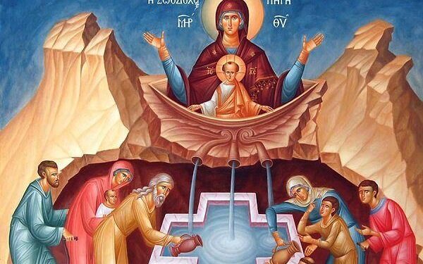 Η αναβλύζουσα Θειον ύδωρ αθάνατον, η προχέουσα ρείθρα ζωής αέναα· τοις προστρέχουσι πιστώς τη Ζωοδόχο σου Πηγή και ταύτα αρυoμένοι, βραβεύεις νυν τε παρθένε ρώσιν και θεραπείαν, και συμφορών απολύτρωσιν.