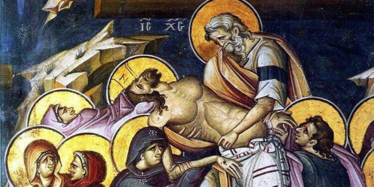 Ὁ εὐσχήμων Ἰωσήφ, ἀπὸ τοῦ ξύλου καθελὼν τὸ ἄχραντόν σου Σῶμα, σινδόνι καθαρᾷ, εἱλήσας καὶ ἀρώμασιν, ἐν μνήματι καινῷ κηδεύσας ἀπέθετο.