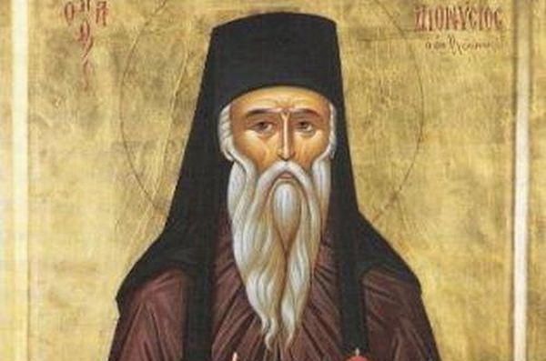 Τοῦ Ὀλύμπου οἰκήτωρ Πιερίας ἀγλάισμα, καὶ τῆς ἐπωνύμου Μονῆς σου ἱερὸν περιτείχισμα, ἐδείχθης Διονύσιε σοφέ, βιώσας ὥσπερ Ἄγγελος ἐν γῇ, καὶ παρέχεις τὴν ταχεῖαν σου ἀρωγήν, τοὶς εὐλαβῶς κραυγάζουσιν δόξα τῷ δεδωκότι σοὶ ἰσχύν, δόξα τῷ σὲ θαυμαστώσαντι, δόξα τῷ ἐνεργούντι διὰ σοῦ πάσιν ἰάματα.