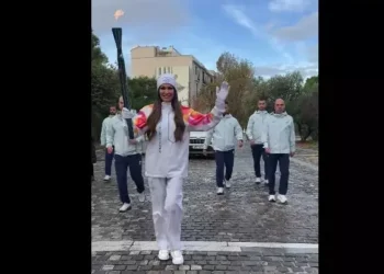 Η Κίμπερλι Γκιλφόιλ λαμπαδηδρόμος στη Διονυσίου Αρεοπαγίτου με τη Φλόγα των Χειμερινών Ολυμπιακών