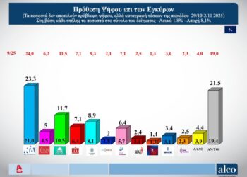 Πτώση μικρότερη της μονάδας για τη ΝΔ και οριακή άνοδο του ΠΑΣΟΚ καταγράφει η ALCO στη δημοσκόπηση που παρουσιάστηκε στο...