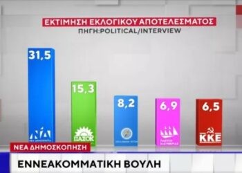 Μεγάλη διαφορά διατηρεί η Νέα Δημοκρατία έναντι του ΠΑΣΟΚ, σύμφωνα με νέα δημοσκόπηση. Η Νέα Δημοκρατία καταγράφει ποσοστό 31,5% στην...