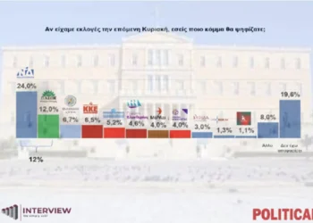 Στο 12% διαμορφώνεται το προβάδισμα της ΝΔ στην πρόθεση ψήφο σύμφωνα με τα αποτελέσματα δημοσκόπησης της Interview Από καταγράφει...