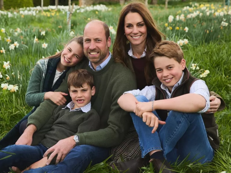 Η λήψη φέρει την υπογραφή του Τζος Σίνερ, ο οποίος επιμελήθηκε και τη φωτογραφία για τα φετινά γενέθλια του πρίγκιπα Τζορτζ. Απεικονίζει τον Ουίλιαμ και την Κέιτ σε ένα καταπράσινο λιβάδι με νάρκισσους, έχοντας στο πλευρό τους τον πρίγκιπα Τζορτζ, την πριγκίπισσα Σάρλοτ και τον πρίγκιπα Λούις.