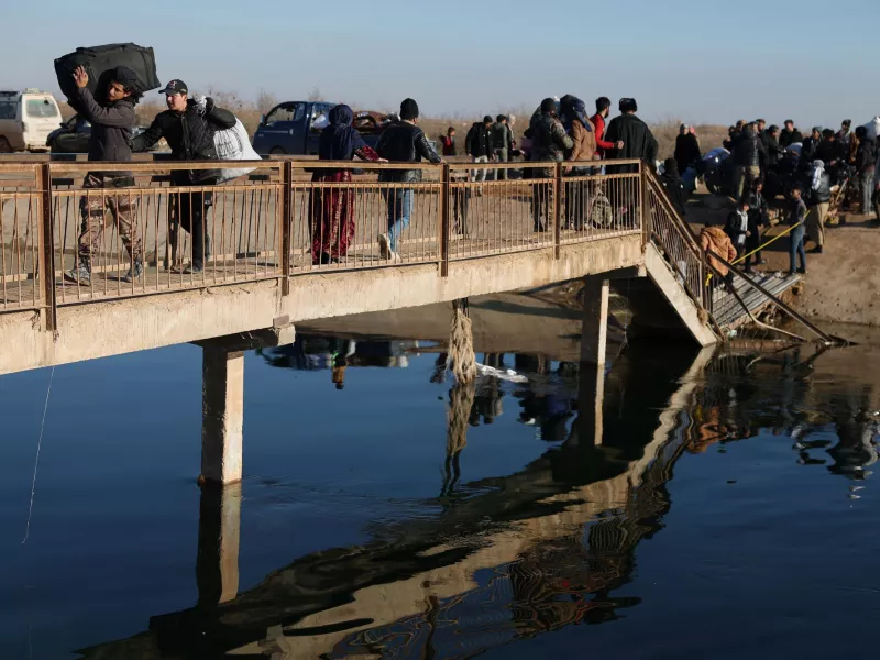 Από χθες, Πέμπτη, οι άμαχοι εγκαταλείπουν την περιοχή μέσω δευτερευουσών διαδρομών, με ορισμένους να χρησιμοποιούν μια ετοιμόρροπη γέφυρα σε παραπόταμο του Ευφράτη (κεντρική φωτογραφία).