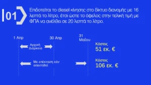 1. Επιδοτείται το diesel κίνησης στο δίκτυο διανομής με 16 λεπτά/λίτρο – όφελος στην τελική τιμή (με ΦΠΑ) σε 20 λεπτά/λίτρο.