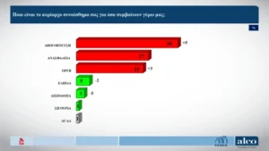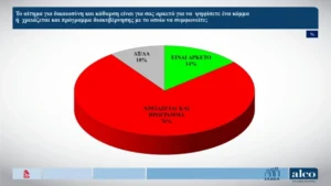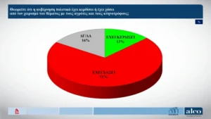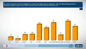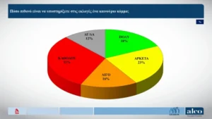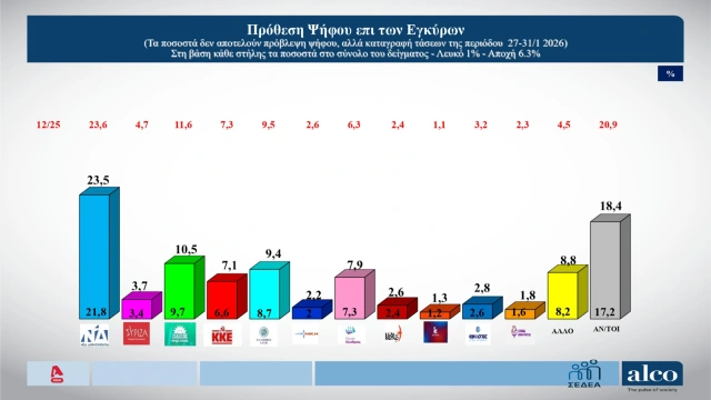 Η δημοσκόπηση της ALCO δείχνει τη Νέα Δημοκρατία σταθερή με 23,5% στην πρόθεση ψήφου, ενώ το ΠΑΣΟΚ χάνει 1,1 μονάδες και πέφτει στο 10,5%