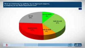 Η Μαρία Καρυστιανού αποσπά συμπάθεια 9% στη Νέα Δημοκρατία, ενώ ο Αλέξης Τσίπρας παρουσιάζει πτώση στις θετικές γνώμες στο σύνολο.