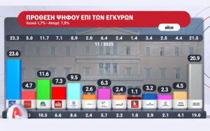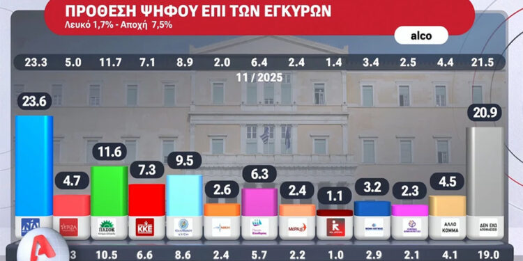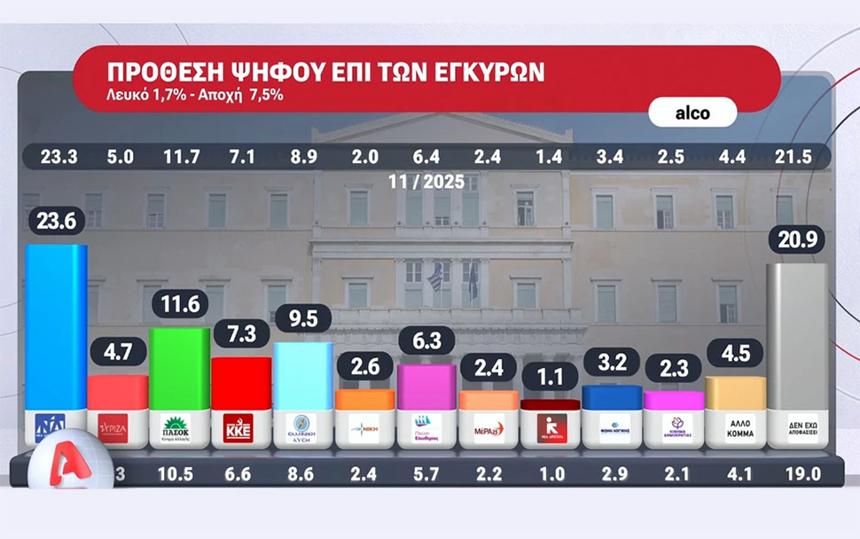 Διαφορά 12 μονάδων της ΝΔ έναντι του ΠΑΣΟΚ, δείχνει η νέα δημοσκόπηση της Alco για λογαριασμό του Alpha