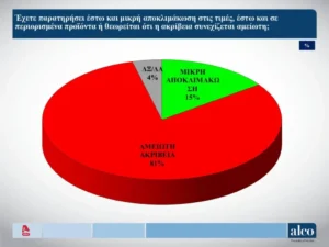 Στην ερώτηση αν έχουν παρατηρήσει αποκλιμάκωση στις τιμές, οι πολίτες απάντησαν στο πλαίσιο της δημοσκόπησης της Alco σε ποσοστό 81% ότι συνεχίζεται αμείωτη η ακρίβεια