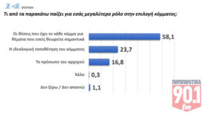 Οι θέσεις των κομμάτων, σύμφωνα με τη δημοσκόπηση της GPO για τον ραδιοφωνικό σταθμό Παραπολιτικά 90,1, συνιστούν το σημαντικότερο κριτήριο επιλογής για το 58,1% του εκλογικού σώματος, με την αντιμετώπιση της ακρίβειας (61,8%), την αναβάθμιση της δημόσιας Υγείας (45,5%) και τον περιορισμό της διαφθοράς (42,6%) να αποτελούν τις βασικές προτεραιότητες των πολιτών στην ατζέντα που επηρεάζει και καθορίζει τις επιλογές τους.