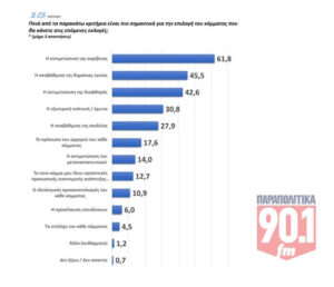 Τα κριτήρια για την επιλογή των κομμάτων είναι βασική παράμετρος της εκλογικής συμπεριφοράς και η συνθετική ανάλυση περιεχομένου των ερωτήσεων ενισχύει τη θεωρία της ορθολογικής ψήφου, βάσει της οποίας η πλειοψηφία των εκλογέων κάνει τις επιλογές της εξετάζοντας τις θέσεις των κομμάτων και το κατά πόσο αυτές συμπίπτουν και συμβαδίζουν με τη δική τους ατομική ιεράρχηση.