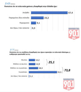 Εκτός της ακρίβειας, που σταθερά απασχολεί την πλειοψηφία των πολιτών τα τελευταία χρόνια, το ζήτημα της διαφθοράς εξελίσσεται σε κορυφαίο πρόβλημα για την κυβερνητική παράταξη, με το 67,4% να πιστεύει ότι επί των ημερών της τα φαινόμενα διαφθοράς έχουν διογκωθεί και έχουν διαβρώσει πολλαπλές πτυχές του δημόσιου βίου. Την ίδια στιγμή, η μεγάλη πλειοψηφία, με 73,8%, θεωρεί ότι αυτές ακριβώς τις περιπτώσεις η κυβέρνηση προσπαθεί να τις συγκαλύψει και όχι να τις φωτίσει, γεγονός που συντηρεί το αίσθημα ατιμωρησίας και ασυδοσίας που έχει εμπεδωθεί στην κοινή γνώμη από την τραγωδία των Τεμπών και το σκάνδαλο του ΟΠΕΚΕΠΕ.