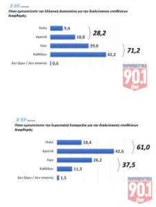 Η γενικευμένη δυσπιστία καταρρακώνει και την αξιοπιστία του θεσμού της ελληνικής Δικαιοσύνης, με μόνο το 28,2% να δηλώνει ότι την εμπιστεύεται, σε αντίθεση με την Ευρωπαϊκή Εισαγγελία, της οποίας ο βαθμός εμπιστοσύνης των Ελλήνων φτάνει στο 61%, με τους περισσότερους να έχουν εναποθέσει στο κοινοτικό όργανο τις προσδοκίες για τη διαλεύκανση των υποθέσεων που ταλανίζουν τη χώρα.