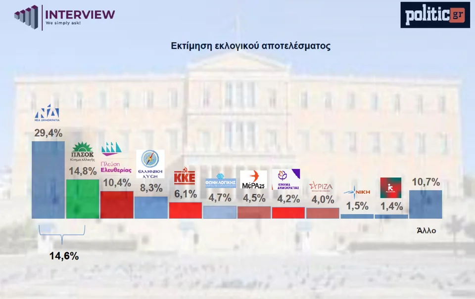 Ξεκάθαρη παραμένει η πρωτιά της ΝΔ με 29,4%, με το δεύτερο ΠΑΣΟΚ να είναι πίσω με 15 μονάδες (14,8%), ενώ η Πλεύση Ελευθερίας συγκεντρώνει 10,4%. Ακολουθούν Ελληνική Λύση (8,3%), ΚΚΕ (6,1%), Φωνή Λογικής (4,7%), Μέρα25 (4,5%), Κίνημα Δημοκρατίας (4,2%) και ΣΥΡΙΖΑ (4%).