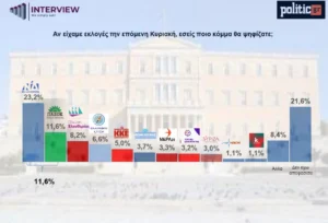 Η δημοσκόπηση της Interview για το politic.gr καταγράφει την εκτίμηση αποτελέσματος, τη δημοτικότητα πολιτικών αρχηγών και υπουργών