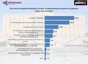 Η δημοσκόπηση καταγράφει, τέλος, τα γεγονότα που σημάδεψαν το 2025, αναδεικνύοντας στην πρώτη θέση την υπόθεση ΟΠΕΚΕΠΕ, στη δεύτερη τα συλλαλητήρια για την τραγωδία των Τεμπών, στην τρίτη τις αγροτικές κινητοποιήσεις και ακολουθούν οι ενεργειακές συμφωνίες της Ελλάδας για έρευνες υδρογονανθράκων και η εκλογή Πιερρακάκη στην προεδρία του Eurogroup.