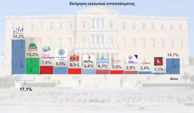 Συγκεκριμένα στην εκτίμηση εκλογικού αποτελέσματος η ΝΔ είναι πρώτη με 32,3% και ακολουθεί από απόσταση 17 μονάδων το δεύτερο ΠΑΣΟΚ με 15,2%. Τρίτη καταγράφεται η Πλεύση Ελευθερίας με 7,6% και έπονται Ελληνική Λύση με 6,5%, ΚΚΕ με 5,3%, ΜεΡΑ25 4,4%, Φωνή Λογικής με 4,1%, ΣΥΡΙΖΑ με 3,5%, Κίνημα Δημοκρατίας με 2,9%, Νίκη με 2,4% και Νέα Αριστερά με 1,1%.
