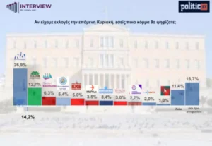 Στο 32,3% μέτρησε τη Νέα Δημοκρατία δημοσκόπηση της Interview για την ιστοσελίδα politic.gr, με την έρευνα να καταγράφει, επίσης, τη στάση των πολιτών απέναντι στη Μαρία Καρυστιανού μετά τις πρώτες δηλώσεις της με πολιτικό περιεχόμενο