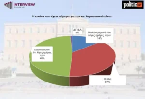 Όσον αφορά, δε, την εικόνα της Μαρίας Καρυστιανού μετά τη συνέντευξη όπου διατύπωσε τις θέσεις για τις αμβλώσεις, το 48% δηλώνει ότι η εικόνα της είναι χειρότερη σε σχέση με λίγες ημέρες πριν, το 37% ότι παραμένει η ίδια, ενώ το 14% ότι είναι καλύτερη.