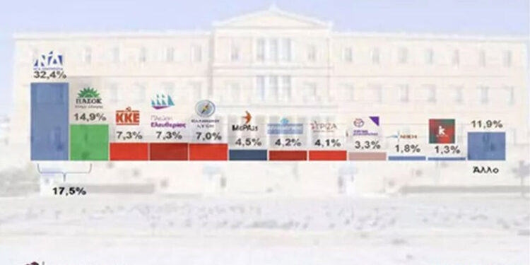 Ειδικότερα: Στην ερώτηση «αν είχαμε εκλογές την επόμενη Κυριακή, ποιο κόμμα θα ψηφίζατε», το 26,4% απαντά τη ΝΔ και ακολουθούν το ΠΑΣΟΚ με 12,1%, το ΚΚΕ με 6%, η Πλεύση Ελευθερίας με 5,9%, η Ελληνική Λύση με 5,7%, το ΜέΡΑ25 με 3,6%, η Φωνή Λογικής με 3,4%, ο ΣΥΡΙΖΑ με 3,4%, το Κίνημα Δημοκρατίας με 2,7%, η Νίκη με 1,5%, η Νέα Αριστερά με 1,1%, άλλο 9,7%, ενώ οι αναποφάσιστοι κινούνται στο 18,5%.