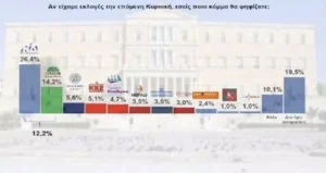 Σε ερώτηση «αν είχαμε εκλογές την επόμενη Κυριακή, ποιο κόμμα θα ψηφίζατε;», το 26,4% απαντά τη ΝΔ, το 14,2% το ΠΑΣΟΚ, το 5,6% την Ελληνική Λύση, το 5,1% το ΚΚΕ, το 4,7% την Πλεύση Ελευθερίας, το 3,5% το ΜέΡΑ25, το 3,5% τη Φωνή Λογικής, το 3% τον ΣΥΡΙΖΑ, το 2,4% τους Δημοκράτες, το 1% τη Νέα Αριστερά, το 1% τη Νίκη, το 10,1% άλλο και το 19,5% «δεν έχω αποφασίσει».