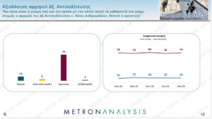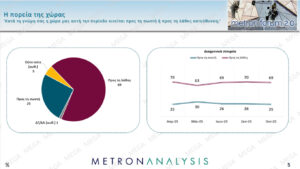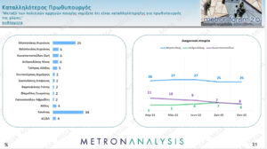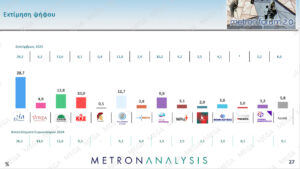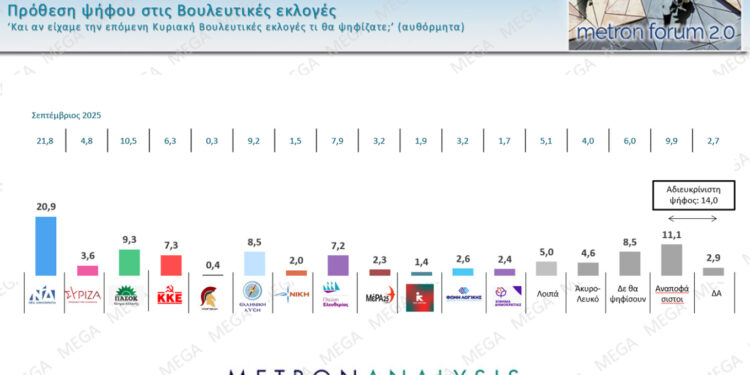 Προβάδισμα 15,9 μονάδων στην εκτίμηση ψήφου συγκεντρώνει η ΝΔ στην τελευταία δημοσκόπηση της Metron Analysis για λογαριασμό του Mega