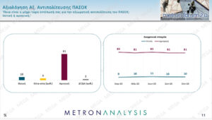 Το 81% αξιολογεί αρνητικά την αξιωματική αντιπολίτευση του ΠΑΣΟΚ- ποσοστό που έμεινε σταθερό- και το 79% τον Νίκο Ανδρουλάκη (από 78%).