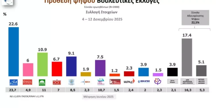 Στην πρόθεση ψήφου, η Νέα Δημοκρατία διατηρεί την πρώτη θέση με 22,6%, ενώ ακολουθεί το ΠΑΣΟΚ με 10,9%. Τρίτη εμφανίζεται η Ελληνική Λύση με 9,1%, ενώ η Πλεύση Ελευθερίας καταγράφει 7,5%. Ακολουθούν το ΚΚΕ με 6,7%, ο ΣΥΡΙΖΑ με 6%, η Φωνή Λογικής με 3,9%, το ΜέΡΑ25 με 2,3%, η Νίκη με 1,9%, το Κίνημα Δημοκρατίας με 1,5% και η Νέα Αριστερά με 1,2%.