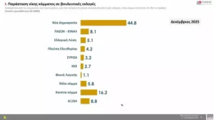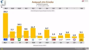 Στην πρόθεση ψήφου, η Νέα Δημοκρατία διατηρεί την πρώτη θέση με 22,6%, ενώ ακολουθεί το ΠΑΣΟΚ με 10,9%. Τρίτη εμφανίζεται η Ελληνική Λύση με 9,1%, ενώ η Πλεύση Ελευθερίας καταγράφει 7,5%. Ακολουθούν το ΚΚΕ με 6,7%, ο ΣΥΡΙΖΑ με 6%, η Φωνή Λογικής με 3,9%, το ΜέΡΑ25 με 2,3%, η Νίκη με 1,9%, το Κίνημα Δημοκρατίας με 1,5% και η Νέα Αριστερά με 1,2%.