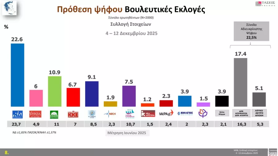 Ιδιαίτερο πολιτικό ενδιαφέρον παρουσιάζουν τα ευρήματα της δημοσκόπησης της MRB (χρόνος διεξαγωγής: 4–12 Δεκεμβρίου), τόσο ως προς την πρόθεση ψήφου όσο και ως προς τα σενάρια ηγεσίας νέων πολιτικών σχηματισμών