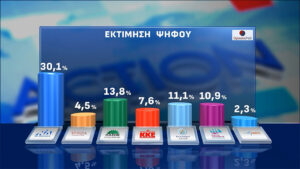 Στην εκτίμηση ψήφου, η ΝΔ συγκεντρώνει 30,1%, το ΠΑΣΟΚ 13,8% και ακολουθούν η Ελληνική Λύση με 11,1%, η Πλεύση Ελευθερίας με 10,9%, το ΚΚΕ με 7,6%, ΣΥΡΙΖΑ με 4,5% και Νίκη με 2,3%