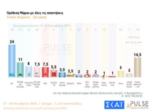 Στην πρόθεση ψήφου, η ΝΔ συγκεντρώνει 24%, το ΠΑΣΟΚ 11%, η Ελληνική Λύση 8%, Πλεύση Ελευθερίας και ΚΚΕ 7,5% και ΣΥΡΙΖΑ 5,5%