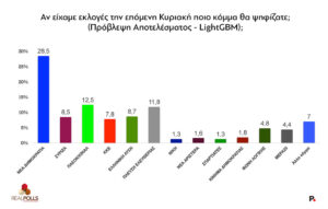Ακολουθούν: Πλεύση Ελευθερίας 11,8%, Ελληνική Λύση 8,7%, ΣΥΡΙΖΑ 8,5%, ΚΚΕ 7,8%, Φωνή Λογικής 4,8% και ΜέΡΑ25 4,4%.