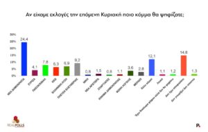 Η έρευνα της RealPolls μετρά, ως γνωστόν, και τις απαντήσεις για την πρόθεση ψήφου στο υποθετικό σενάριο που όλα τα κόμμα είχαν διαφορετικό αρχηγό (Πίνακας ΙΙΙ). Η ΝΔ χωρίς τον Κυριάκο Μητσοτάκη υποχωρεί στο 22,6%, ενώ το ΠΑΣΟΚ-ΚΙΝΑΛ χωρίς τον Νίκο Ανδρουλάκη εκτινάσσεται από το 7,8% στο 15,7%. Κόμματα αρχηγικά, όπως η Πλεύση Ελευθερίας και η Ελληνική Λύση, βλέπουν τα ποσοστά τους να εξαερώνονται.