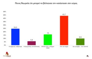 Μια δεύτερη ανάγνωση της μέτρησης της RealPolls έχει να κάνει με μια υφέρπουσα κρίση του πολιτικού συστήματος, γεγονός που μπορεί να θεωρηθεί ως μια μαγιά για την ανάδειξη νέων κομματικών σχηματισμών. Είναι χαρακτηριστικό ότι στην ερώτηση «Εμπιστεύεστε το υπάρχον πολιτικό σύστημα» (Πίνακας IV), μόλις το 33,2% απαντά θετικά (14,3% «σίγουρα ναι» και 18,9% «μάλλον ναι»), ενώ το 66,1% δηλώνει δυσπιστία (24% «μάλλον όχι» + 42,1% «σίγουρα όχι»). Η δυσπιστία αυτή δεν παραμένει θεωρητική. Όταν οι πολίτες ερωτώνται «ποιος μπορεί να βελτιώσει την κατάσταση στη χώρα» (Πίνακας V), οι απαντήσεις είναι ενδεικτικές: Το 43,7% απαντά «ένα νέο κόμμα», το 24,5% η σημερινή κυβέρνηση, το 16% κάποιο άλλο υπάρχον κόμμα, και μόλις το 5,8% η αξιωματική αντιπολίτευση.