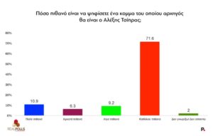 Στο σύνολο, στην ερώτηση «Ποιο κόμμα πιστεύετε ότι θα έρθει δεύτερο;» (Πίνακας VII), το ΠΑΣΟΚ-ΚΙΝΑΛ προηγείται με 30,4%, ακολουθεί το πιθανολογούμενο κόμμα Καρυστιανού με 14,9%, η Πλεύση Ελευθερίας με 9,8% και το κόμμα Τσίπρα είναι πέμπτο με 9,3%.