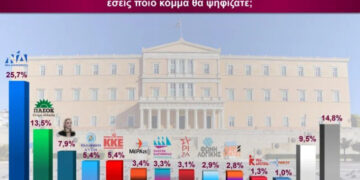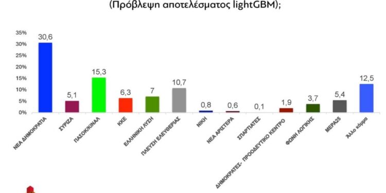 Ακολουθούν η Ελληνική Λύση με 7% και το ΚΚΕ με 6,3%. Ο ΣΥΡΙΖΑ εμφανίζεται στο 5,1%, σε επίπεδα χαμηλότερα από άλλα κόμματα της αντιπολίτευσης.