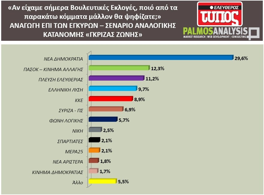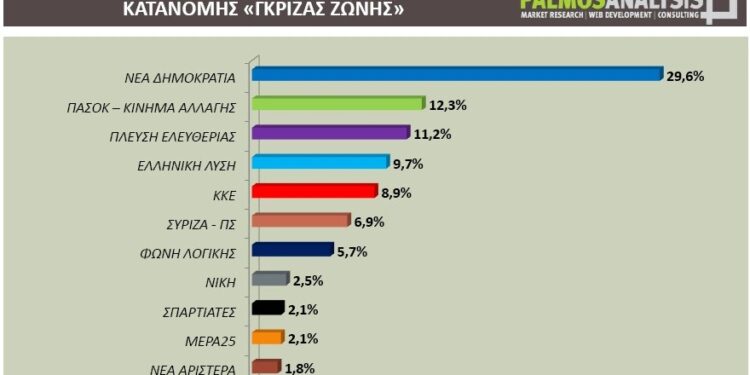 Ξεκάθαρο προβάδισμα διατηρεί η Νέα Δημοκρατία σε δημοσκόπηση της Palmos Analysis που δημοσιεύθηκε στον Τύπο της Κυριακής