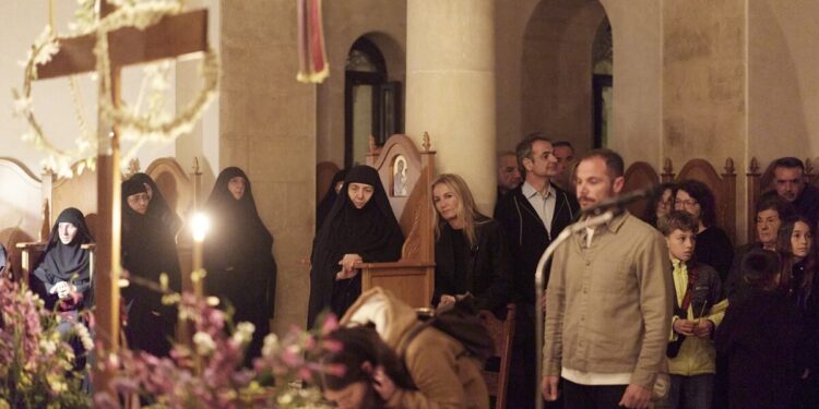 Σε κλίμα κατάνυξης ο πρωθυπουργός Κυριάκος Μητσοτάκης, συνοδευόμενος από τη σύζυγό του Μαρέβα Γκραμπόφσκι, παρακολούθησαν την Ακολουθία και Περιφορά του Επιταφίου στην Ιερά Μονή Μεταμορφώσεως του Σωτήρος στα Χανιά