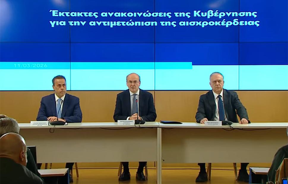 Έκτακτα μέτρα για την αναχαίτιση του κύματος αισχροκέρδειας στον τομέα της ενέργειας ανακοίνωσαν εκ μέρους της κυβέρνησης ο αντιπρόεδρος, Κωστής Χατζηδάκης, ο υπουργός Περιβάλλοντος και Ενέργειας Σταύρος Παπασταύρου και ο υπουργός Ανάπτυξης Τάκης Θεοδωρικάκος