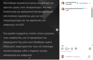 Στο μήνυμά της, η σύζυγος του πρωθυπουργού αναφέρθηκε στην εμπειρία της νοσηλείας της, σημειώνοντας ότι είχε την ευκαιρία να διαπιστώσει από κοντά όσα, όπως έγραψε, άκουγε συχνά από πολίτες για την καθημερινή προσπάθεια των ανθρώπων του δημόσιου συστήματος υγείας.