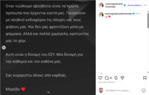 Μαρέβα Γκραμπόφσκι-Μητσοτάκη: Μια σοβαρή περιπέτεια υγείας με κράτησε για αρκετές μέρες στον Ευαγγελισμό – Το ευχαριστώ στους γιατρούς του ΕΣΥ
