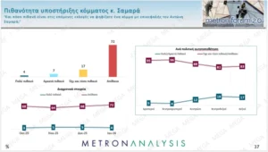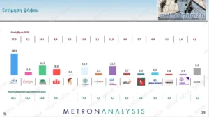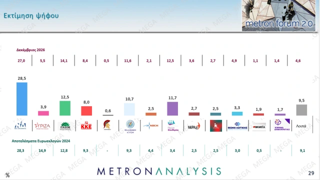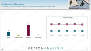 Η δημοσκόπηση της Metron Analysis δείχνει ανάκαμψη για τη ΝΔ και απώλειες για το ΠΑΣΟΚ σε σχέση με τον Δεκέμβριο.
