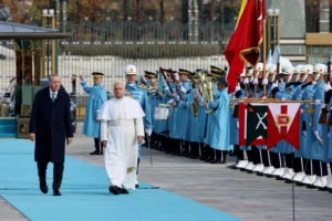 Ξεκίνησε η επίσημη υποδοχή στο προεδρικό μέγαρο του Πάπα Λέοντος από τον πρόεδρο Ερντογάν, ο οποίος καλωσόρισε τον Πάπα Λέοντα στην ιδιαίτερα σημαντική επίσκεψη, παρουσία και του Οικουμενικού Πατριάρχη Βαρθολομαίου, σύμφωνα με επίσημη ανακοίνωση του Οικουμενικού Πατριαρχείου.
