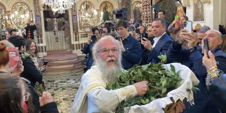 Σε ένα σκηνικό απόλυτης συμμετοχής και συμβολικής έντασης, ο ιερέας σκόρπισε δάφνες, σύμβολα της νίκης και της αιώνιας ζωής, σε ολόκληρο τον ναό. Οι εικόνες ήταν εντυπωσιακές: οι πολυέλαιοι κουνιούνταν σαν από σεισμό και η συγκίνηση κορυφώθηκε, με όλους τους παρευρισκόμενους να μετέχουν ενεργά στην τελετουργία.