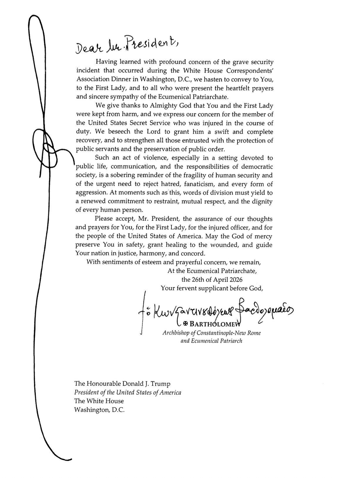 Τραμπ: Ιδιαίτερο διεθνές ενδιαφέρον προκαλεί το πατριαρχικό γράμμα του Οικουμενικού Πατριάρχη κ.κ. Βαρθολομαίου προς τον Πρόεδρο των Ηνωμένων Πολιτειών Donald Trump, μετά την επίθεση που σημειώθηκε κατά τη διάρκεια του δείπνου της Ένωσης Ανταποκριτών του Λευκού Οίκου.