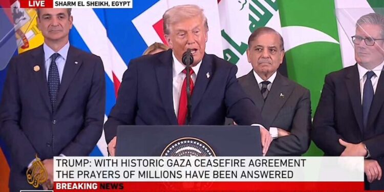 Πιο αναλυτικά, ο Ντόναλντ Τραμπ και οι μεσολαβητές της Αιγύπτου, του Κατάρ και της Τουρκίας υπέγραψαν νωρίτερα τη συμφωνία για το τέλος του πολέμου στη Γάζα. Στην ομιλία του στην έναρξη της συνόδου του Σαρμ ελ Σέιχ, ο Αμερικανός πρόεδρος χαρακτήρισε τη σημερινή ημέρα «σπουδαία για τη Μέση Ανατολή».