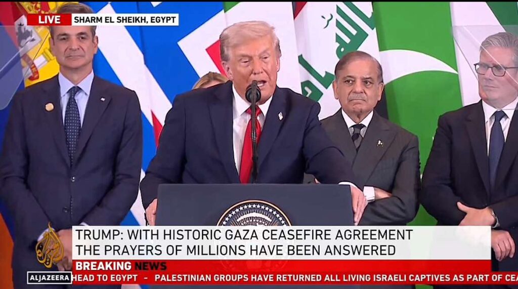 Ο Ντόναλντ Τραμπ ανέβηκε στο βήμα μετά την υπογραφή της συμφωνίας ειρήνης και είπε ότι αυτή «είναι η ημέρα για την οποία άνθρωποι σε όλη την περιοχή και σε όλο τον κόσμο εργάζονται, αγωνίζονται, ελπίζουν και προσεύχονται».